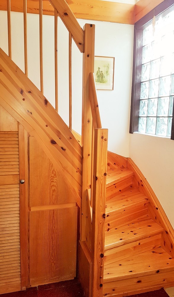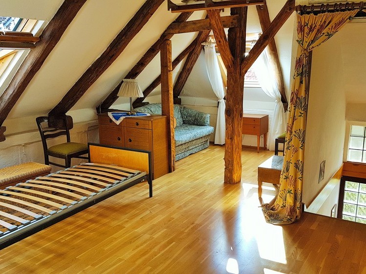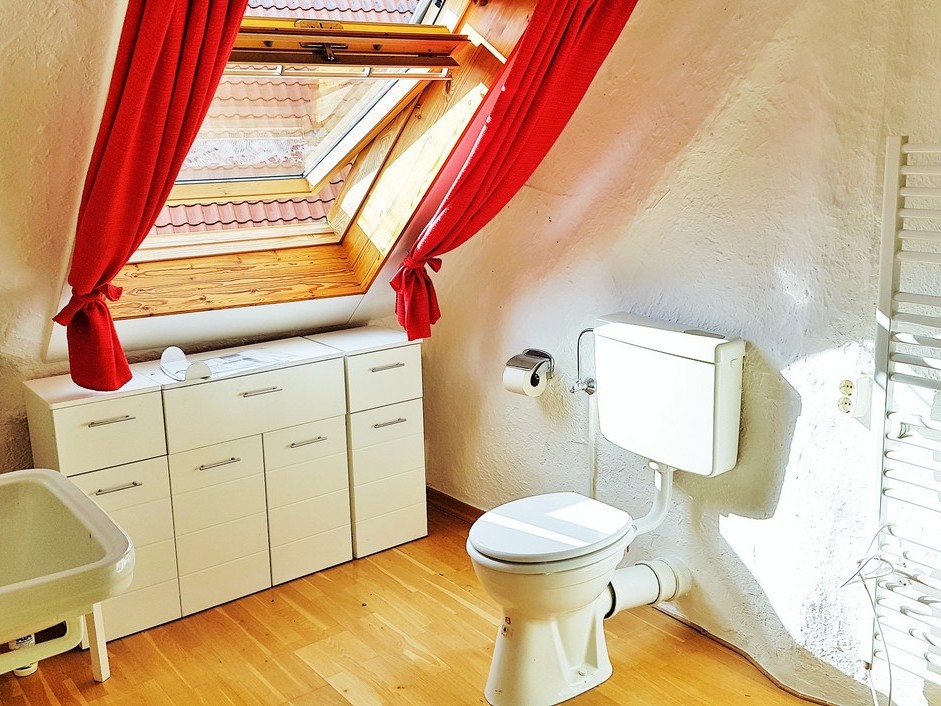 Über eine neue Holztreppe gelangt man ins weitläufige und helle Obergeschoss wo sich ein weiteres Schlafzimmer und ein Kinderzimmer, sowie ein Wohnzimmer mit anliegendem Duschbad mit Toilette befindet.