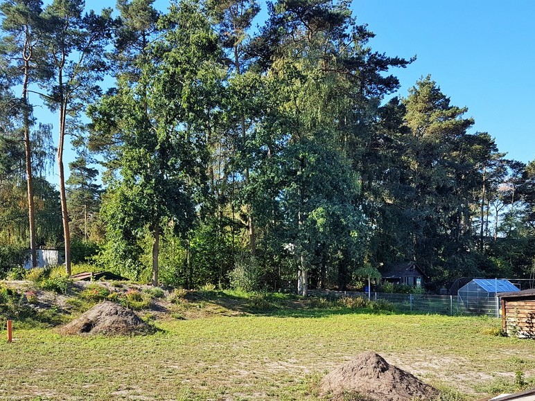 Garten: mit Bäumen, Sträuchern und großer Rasenfläche